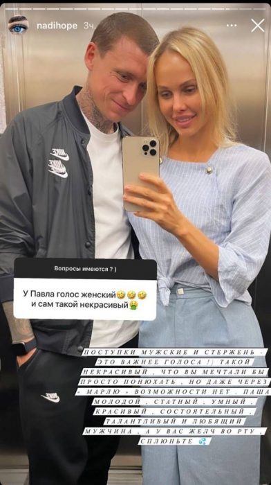 Назло хейтерам Надежда публикует в Инстаграм совместные фото с возлюбленным и демонстрирует полную идилию с Павлом. Похоже, пользователи не верят бывшей подруге Аланы. Недавно ей написали, что Мамаев - некрасивый, да и голос у него женский. Надежда тут же решила вступиться за избранника.