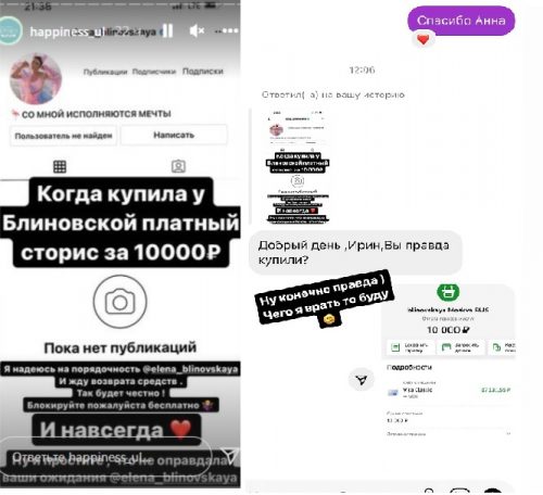 «Когда купила у Блиновской платные сторис за 10 000 рублей. Я надеюсь на ее порядочность и жду возврата средств. Так будет честно. Блокируйте, пожалуйста, бесплатно и навсегда. Ну и простите, что не оправдала ваши ожидания», - написала одна из пользователей сети, показав заблокированную страницу коуча.