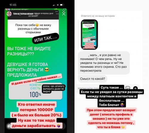 «Вы тоже не видите разницы? Девушке готова вернуть деньги, предложила», — отметила Блиновская в своих сторис, сопроводив текст опросом.
