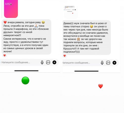 Несмотря на недовольство некоторых подписчиков, блогер надеется, что действительно помогает людям. В своих сторис она публикует положительные отзывы от фолловеров: «Вчера ревела, сегодня реву. Лена, спасибо за эти дни. Пока прошла 3 марафона, но эти «близкие друзья» творят со мной невероятное», «Муж сначала был в шоке от темы платных сториз. Но за час дороги мы подняли вопросы, которые меня торкнули за эти дни, он мне: «Круто, а там нет годовой подписки?».