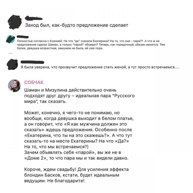 «Шаман и Мизулина действительно очень подходят друг другу — идеальная пара «Русского мира», так сказать. Может, конечно, я чего-то не понимаю, но вообще, когда девушка выходит в белом платье, а он говорит, что «Я как мужчина должен это сказать» ждешь предложения. Особенно после «Екатерина, что ты на это скажешь? ». А что тут сказать-то на месте Екатерины? На что «Да? » На то, что мы встречаемся? Зачем объявлять себя «парой», вы же не в «Доме 2», то что пара мы и так видели давно», — выразила негодование бывшая ведущая любовного реалити в своем Telegram-канале.