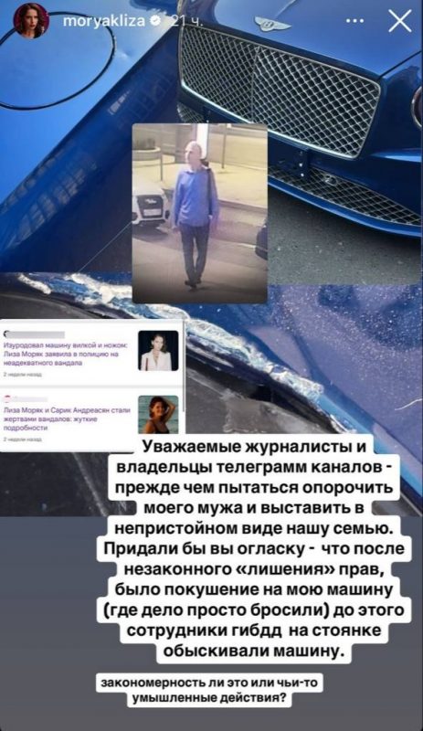 Жена Андреасяна также высказалась в его защиту, назвав лишение водительских прав незаконным. Заодно она посоветовала СМИ вспомнить, что после того, как ей изуродовали машину, участковый просто «забил» на этот инцидент. Тогда неизвестный раскурочил ножом машину актрисы прямо на стоянке под их домом. Причём досталось и авто Сарика, которое было припарковано напротив.