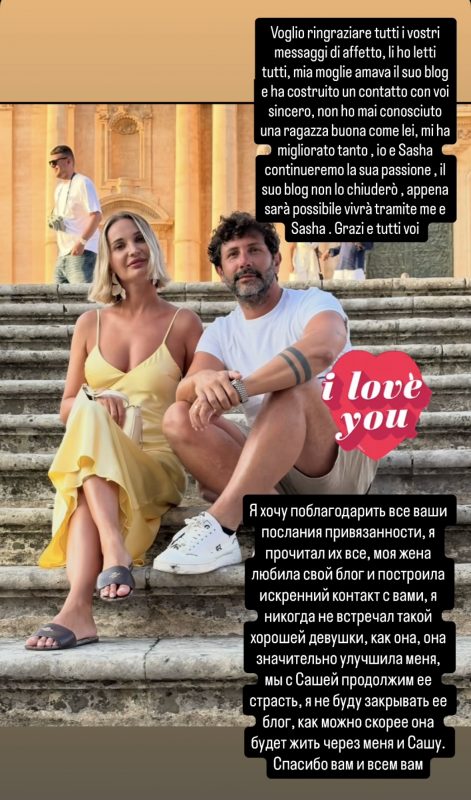 Также он заявил, что продолжит воспитывать дочь Юлии Сашу, несмотря на то что у девочки есть родственники в России. По словам Ночерино, именно через него и ребенка память о Юлии будет жить дальше. Вдовец поблагодарил пользователей за поддержку, отметив, что прочитал все сообщения, которые они ему направили. Он подчеркнул, что его жена искренне любила свой блог и сумела выстроить теплый и честный контакт с аудиторией. По его словам, он никогда прежде не встречал столь доброго человека, и добавил, что именно Юлия во многом изменила его к лучшему.