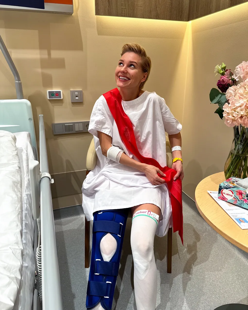 Накануне Кристина сообщила, что наконец-то вернулась домой. Новогодние праздники она проведет с гипсом на ноге, и передвигаться по квартире сможет только с помощью костылей. Несмотря на это 36-летняя актриса продолжает сохранять оптимизм и даже о такой неприятной ситуации говорит с юмором. По словам Асмус, она «выпустилась» из больницы, но вместо выпускной ленты - резинкой для занятий в рамках реабилитации.