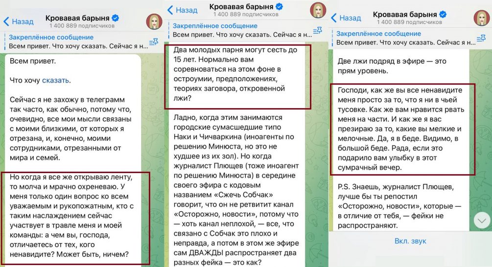 Собчак отметила, что хотя не удивлена публикациям с предположениями и теориями заговора от «городских сумасшедших» Майкла Наки* и Евгения Чичваркина*, но подобного же отношения от Александра Плющева* не ожидала. Кроме того, по словам журналистки, деятель Рунета в своем эфире с кодовым названием «Сжечь Собчак» распространял откровенную ложь про ее маму, голосование и «фейковый» Telegram-канал «Тушите свет», в котором сейчас специально дискредитируют блондинку.