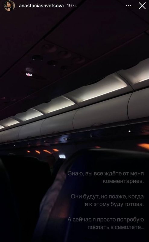 «Знаю, вы все ждете от меня комментариев. Они будут, но позже, когда я к этому буду готова. А сейчас я просто попробую поспать в самолете», — написала Анастасия.