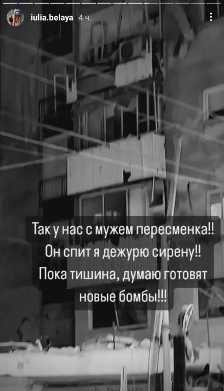 Юлия сняла на видео, как она в халате и тапочках посреди ночи бежит в укрытие, так как на улице слышны взрывы. По словам Белой, избранник уговаривал ее эвакуироваться из города, но она отказалась. Юлия заявила, что хочет быть со своим супругом в тяжелый момент.