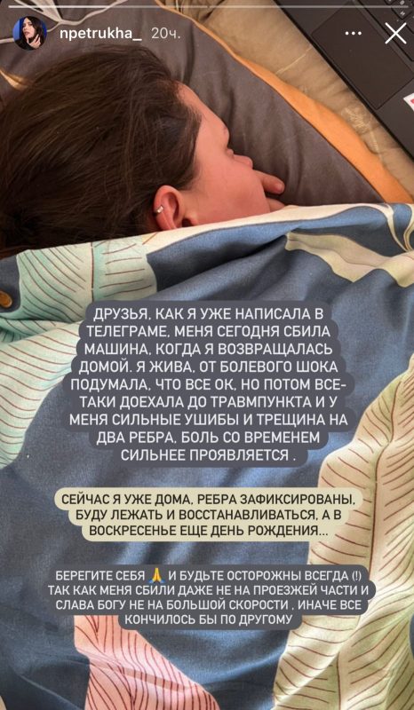 После осмотра врачей Анастасия снова вышла на связь и уточнила, что в результате наезда авто получила две трещины в ребрах, а также сильные ушибы. Кожа повреждена на руках и ногах.