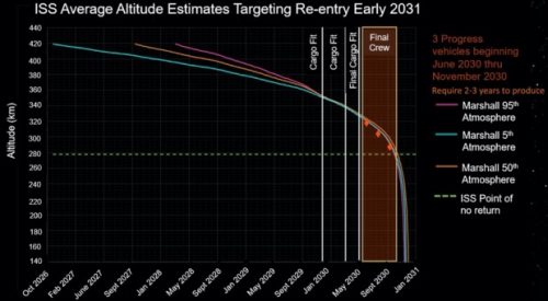 В докладе НАСА говориться, что Международную космическую станцию (МКС) могут увести с орбиты и затопить в Тихом океане в январе 2031 года. Начало вывода с орбиты должно начаться с конца 2026 года по начало 2028. Точку невозврата аппарат достигнет в конце 2030 года. Также в документе организации приводится таблица, где показан график ухода МКС с орбиты с последующим затоплением в океане.