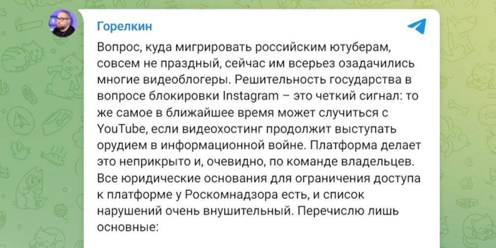 «Решительность государства в вопросе блокировки Instagram* — это четкий сигнал: то же самое в ближайшее время может случиться с YouTube, если видеохостинг продолжит выступать орудием в информационной войне», — отмечал депутат.