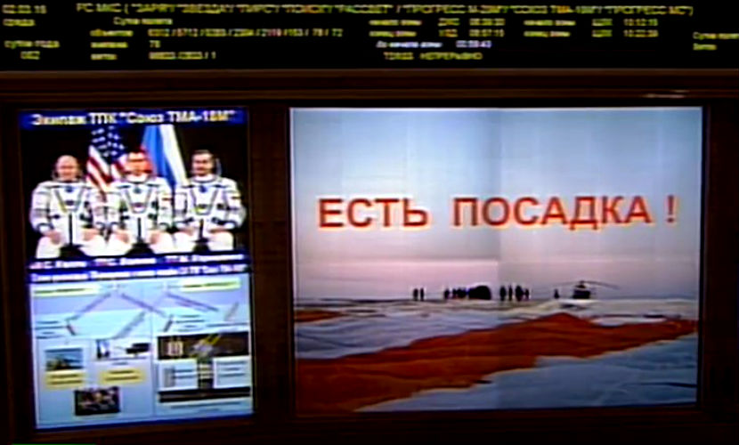 Успешное приземление двух космонавтов из России и астронавта из США прошло в казахстанской степи недалеко от города Жезказган в 7:30 по московскому времени. За последними минутами полета велось наблюдение из Центра управления полетами.
