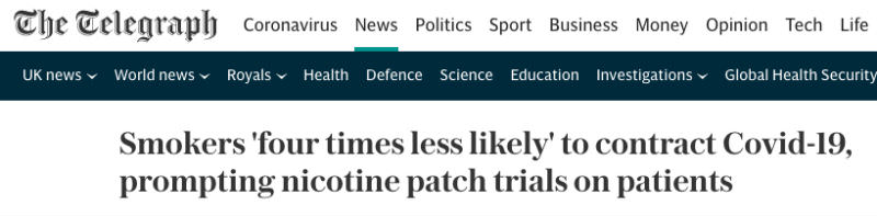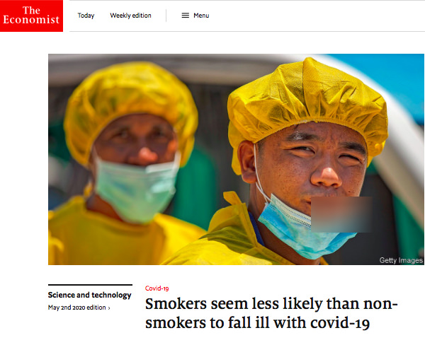 Но теперь об этом пишут и солидные издания, например The Telegraph, утверждающий, что курильщики болеют коронавирусной инфекцией в четыре раза реже. А по данным медицинского журнала JAMA, некурящие среди страдающих тяжёлых формой COVID-19 составляют 84%.
