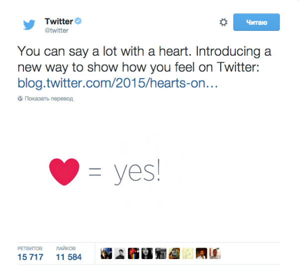 Теперь Twitter не уступает другим известным социальным сетям, таким как Facebook и ВКонтакте. Разработчики компании поменяли кнопку в виде звездочки «избранное» на сердечко - «лайк».