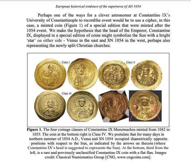 При жизни императора Константина IX, скончавшегося в январе 1055-го, и были отлиты те самые монеты, в которых было запечатлено знамение. Ученые, тщательно изучив 36 монет, которые находятся в разных музеях мира и частных коллекциях, обратили внимание на некоторую странность. Они увидели две звезды. Дело в том, что одна звезда традиционно размещалась на монетах, олицетворяя Солнце, а здесь появилась вторая.