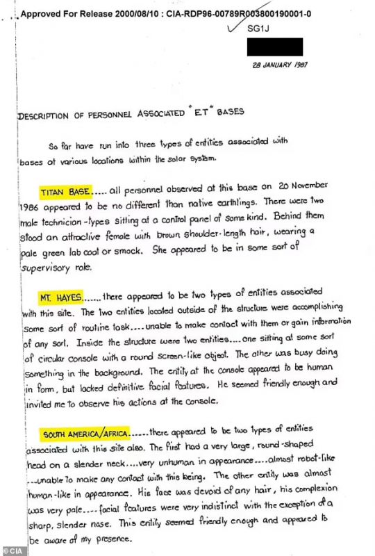 Согласно материалам, опубликованным Daily Mail, в рассекреченных документах ЦРУ содержатся шокирующие сведения о трех предполагаемых инопланетных базах. Две из них, как утверждается, расположены на Земле (на Аляске и в Африке), а третья - на Титане, спутнике Сатурна. Эти данные были получены в ходе сверхсекретной программы «дистанционного наблюдения», проводившейся американскими спецслужбами в 1970-80-х годах. В экспериментах участвовали люди, заявлявшие о паранормальной способности видеть и описывать удаленные объекты.
