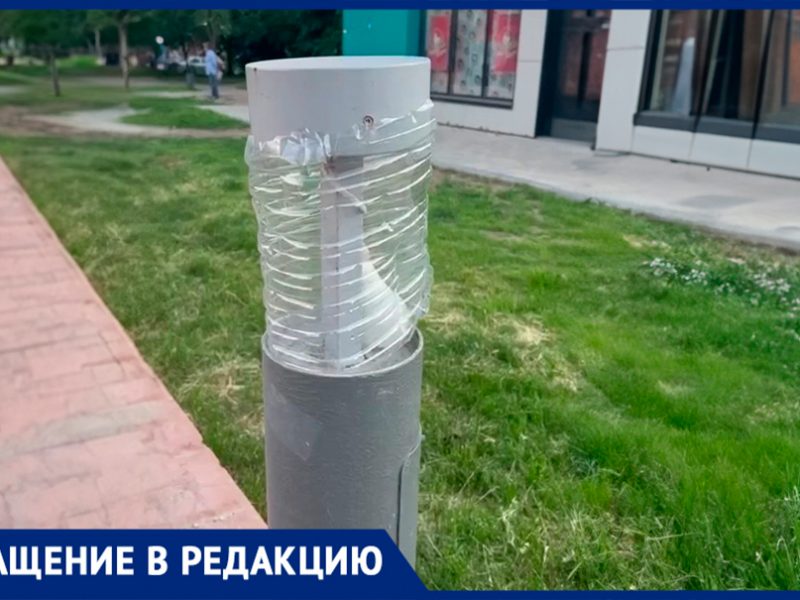 В подтверждение своих слов, она прислала видео. На нем видно, что на некоторых фонарях часть основания и лампа закрыты обрезанными пятилитровыми бутылками. Конструкция в некоторых местах закреплена саморезами.