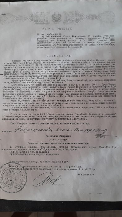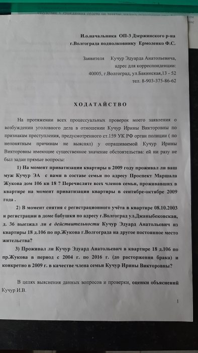 Два года я добиваюсь, чтобы следователи задали, наконец-то, моей супруге и старшему сыну самый важный вопрос: «Проживал ли я в составе семьи в спорной квартире в момент её приватизации в 2009 году, а также с 1994 по 2016 годы?» Добиваюсь, чтобы сравнили её объяснения с документами, представленными полиции, из которых следует, что местом моего жительства в 1994 - 2016 годах, в том числе и на момент приватизации квартиры, оставалась эта самая квартира. Прошу правоохранительные органы сопоставить эти данные с ложностью объяснений Ирины, которые она доводила до суда через своего представителя – адвоката Елену Балакир, а также сама лично в отделе полиции № 3 дала ложные объяснения, где солгала, что её муж в 2003 году оставил семью переехал в другое место жительства».