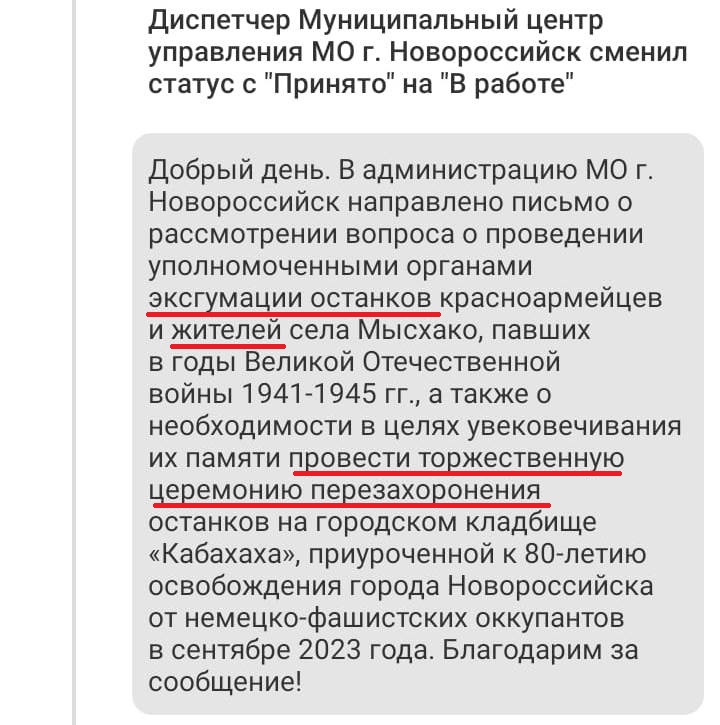 «Осенью 2021 года мы узнали, что в нашем селе Мысхако есть неучтенное захоронение, расположенное между домами № 33 и 35 по ул. 8я Гвардейская. Тогда на него обратил внимание наш участковый. По факту за могилками ухаживала 92-летняя старушка, проживающая неподалеку. Участковый не только помог в расчистке, но и привлек внимание к теме. На место выехали поисковики. Обследовали все. Визуально определили, что расположено 20 могил. На 16ти плохо сохранившиеся кресты и надгробия. Со слов местных, на данном кладбище захоронены советские военнослужащие и мирные жители, погибшие в годы оккупации и освобождения Новороссийска. Также, с их слов, три могилы обозначенные красными звездами, являются братскими могилами. Бабуля, участковый, поисковики и несколько неравнодушных граждан навели порядок, покрасили кресты. Насколько смогли, поправили могилки. Даже приезжал местный священник. Но как я понимаю, на этом все и закончилось. Согласно открытым данным, земля так и не была переведена под «земли захоронений». Через приложение «Мой Новороссийск» задали вопрос в администрацию, так что же дальше? Так вот нам ответили, что в планах останки эксгумировать и перезахоронить. Но как? Кто это будет делать? Это кладбище, это не внезапно обнаруженные останки! И получается, что вместо того, чтобы установить имена, придать официальный статус, наша администрация решила просто избавиться от тех, кто защищал наш город!», - недоумевают жители.