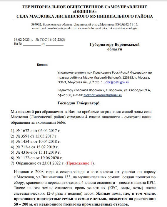 Жители села Масловка просят губернатора повлиять на ситуацию и требуют очистить муниципальные территории от отходов четвертого класса опасности, принять меры по недопущению систематического загрязнения, выявить ответственных за санитарное и экологическое состояние данных земель, принять меры в отношении должностных лиц местной исполнительной власти, по вине/бездействию которых с 2008 по 2023-й осуществляется загрязнение.