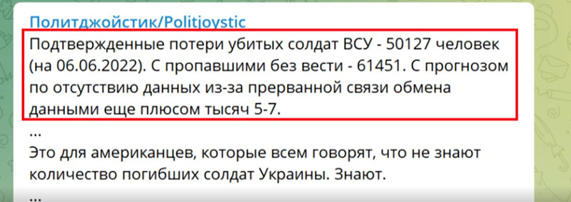 «Посмотрите на список оружия, нужного украинцам. Это убедительное доказательство того, что им надирают задницы. Если вам нужно тысячу артиллерийских орудий, значит, вы потеряли тысячу орудий. Если вам нужно 500 танков, значит, вы уже потеряли 500 танков. Это суровый факт! И это все связано с человеческими жизнями. На каждый уничтоженный танк приходится три-четыре погибших, на каждое орудие – пять-шесть жизней. Это значит, что они потеряли эти тысячи человек. А есть еще пехота, есть проблемы с логистикой. Они признали, что в день у них погибает 200 человек, но на самом деле это число приближается к 600-800 смертей в день. Один день – и 800 человек погибли!»