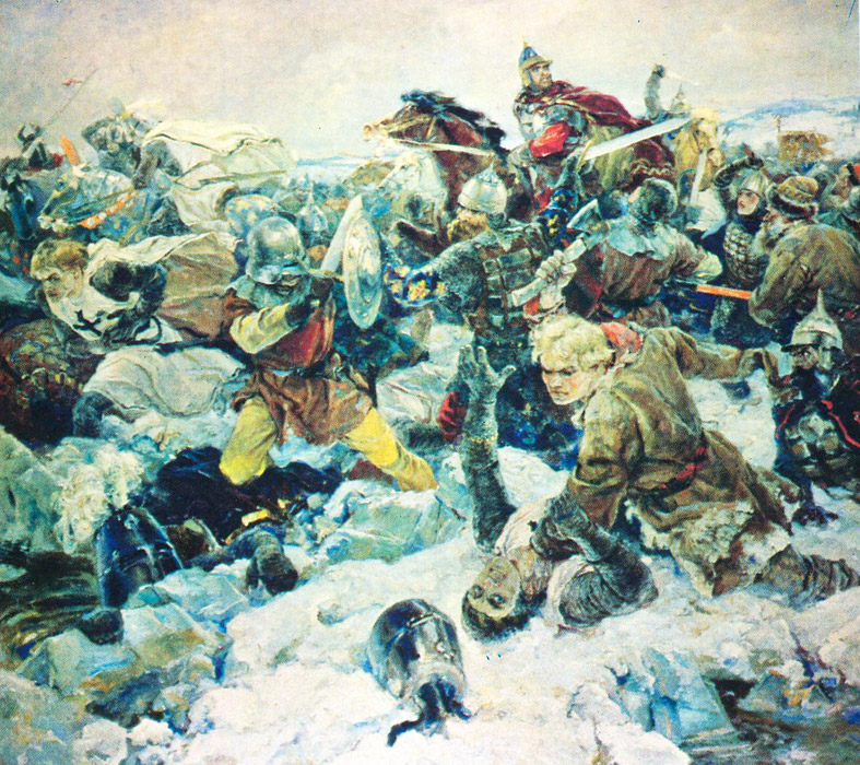 Подробнее поговорим о Ледовом побоище (битве на Чудском озере) с участием новгородцев и владимирцев под предводительством Александра Невского с одной стороны и войсками Ливонского ордена — с другой. Именно в честь этого сражения был установлен день воинской славы России, отмечаемый 18 апреля.