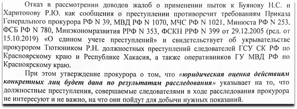 И действительно, таких коллективных жалоб на нашей памяти ещё не было. Изложенные в ней факты могут свидетельствовать о настоящей «ОПГ в погонах», которая пытает невиновных, в массовом порядке фальсифицирует обвинения, сажает не способных защитить себя людей, а потом еще и покрывает членов своей преступной группировки от наказания. Конечно, мы огульно никого не обвиняем и не делаем никаких выводов на основании только лишь одной коллективной жалобы. Но десятки доказательств, показания свидетелей, документы юристов и отсутствие какой-либо публичной реакции на весь этот беспредел наводит на очень мрачные мысли относительно правосудия в Красноярском крае…