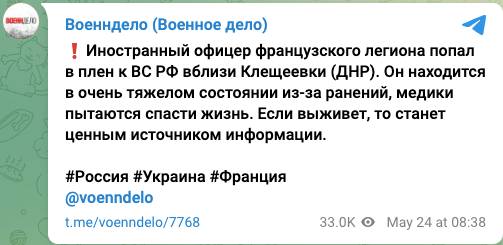 Офицер французского легиона попал в плен к российским военным возле Клещеевки (ДНР), которую освободили ВС РФ. Однако выяснилось, что пленный находится в тяжелейшем состоянии. Российские врачи борются за его жизнь. Пока остается неясным, является ли пленный кадровым офицером французского иностранного легиона или он - банальный наемник.