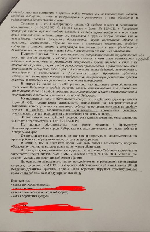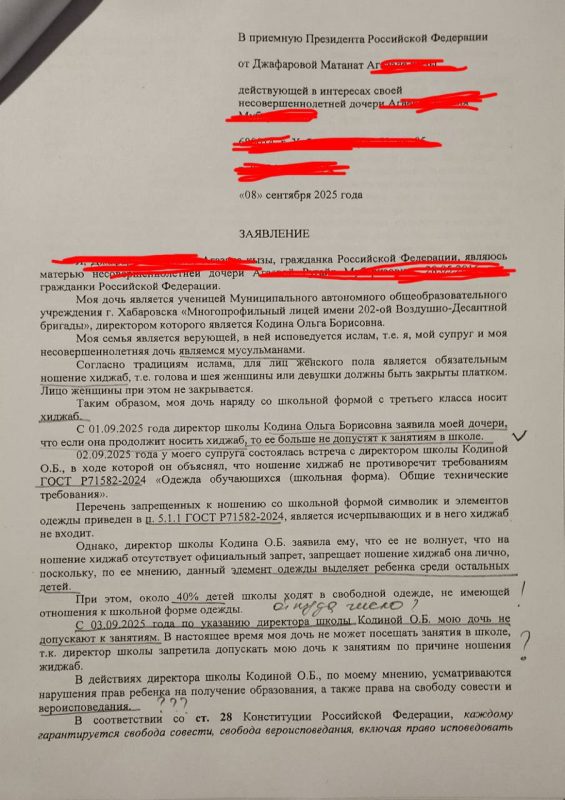 «Таким образом, моя дочь наряду со школьной формой с третьего класса носит хиджаб. С 01.09.2025 года директор школы Кодина Ольга Борисовна заявила моей дочери, что если она продолжит носить хиджаб, то ее больше не допустят к занятиям в школе. 02.09.2025 года у моего супруга состоялась встреча с директором школы Кодиной О.Б., в ходе которой он объяснял, что ношение хиджаб не противоречит требованиям ГОСТ Р71582-2024 «Одежда обучающихся (школьная форма). Перечень запрещённых к ношению со школьной формой символик и элементов одежды приведён в п. 5.1.1 ГОСТ Р71582-2024, является исчерпывающих и в него хиджаб не входит».