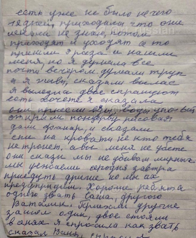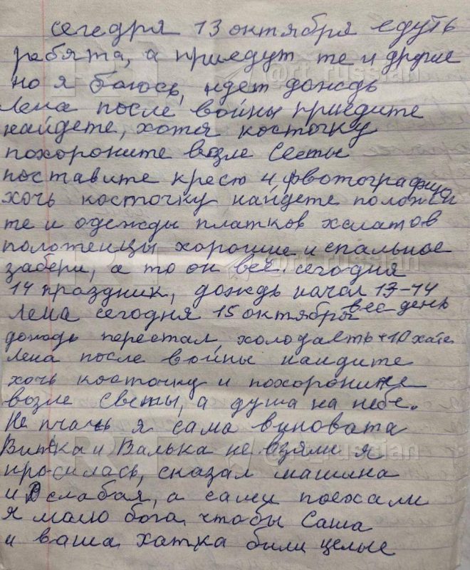 «Читая это прощальное письмо-дневник, невозможно не думать о том, что пережила несчастная женщина. Какими были её последние дни. Это хуже, наверное, даже страшной нашей Блокады. Умирать в одиночестве от голода и холода, на оккупированной врагом территории, на старости лет. Она ведь, эта отважная, очень простая русская женщина, ещё пытается в последнем письме-дневнике успокаивать близких….А ещё, читая этот дневник, невозможно не вспомнить, как в первые дни наступления ВСУ, отдельные граждане писали, что военкоры поднимают панику на пустом месте, что нет никого наступления, что ситуация под контролем, и вообще это такой хитрый план такой нашего командования. Отработали вводные, конечно, понимаем. Цена этих отработок вот такие последние письма, подвалы, забитые телами запытанных русских людей».
