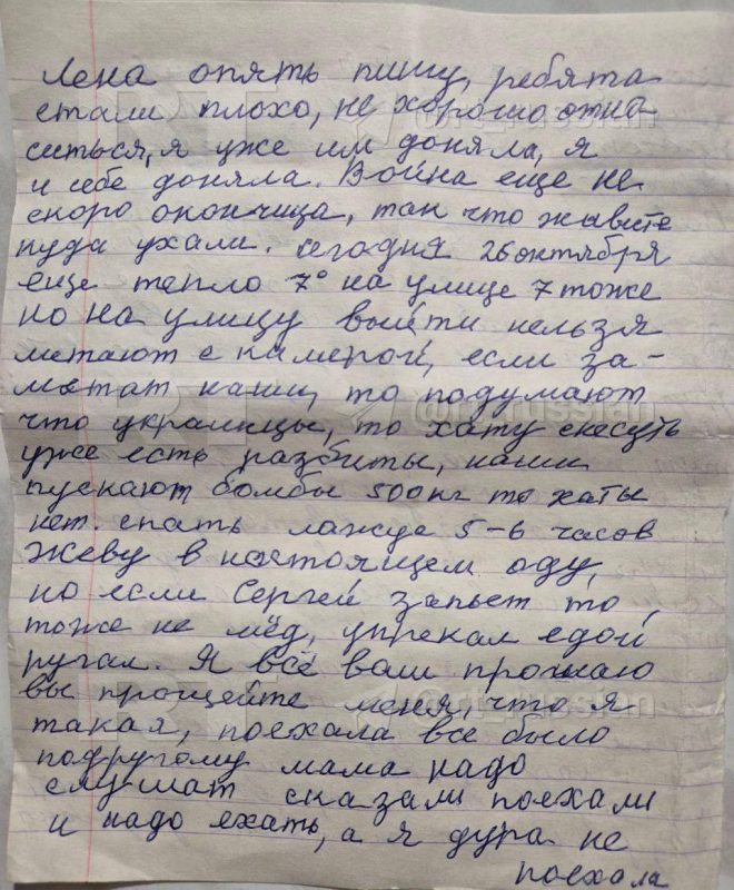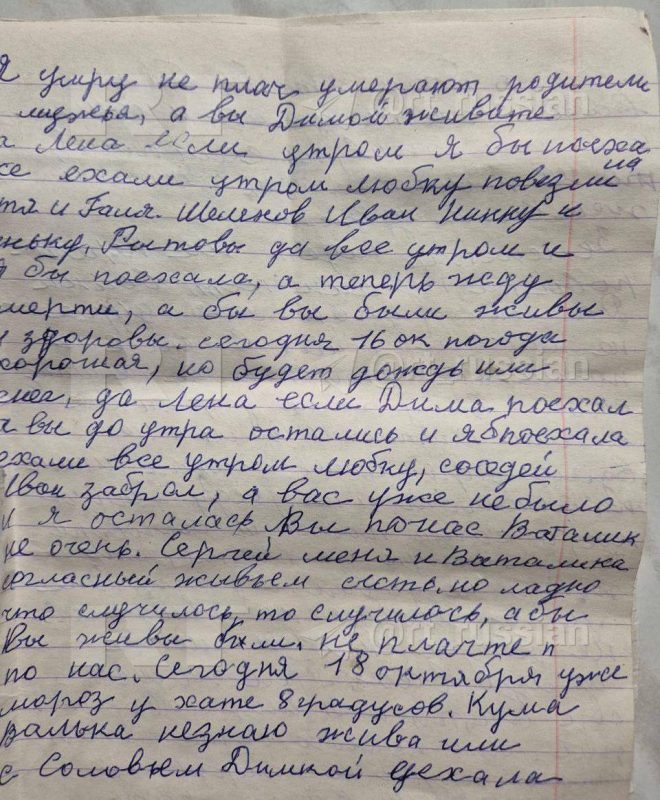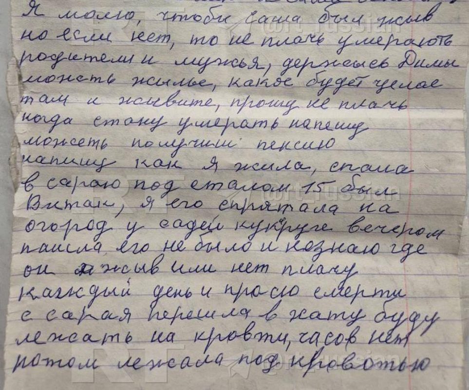 «Прощайте, дети, не увидимся, ни я вас, ни вы меня, целую всех». «Лена, Дима, берегите друг друга. Лена, не плачь, умирают родителя, мужья, ничто не сделаешь».