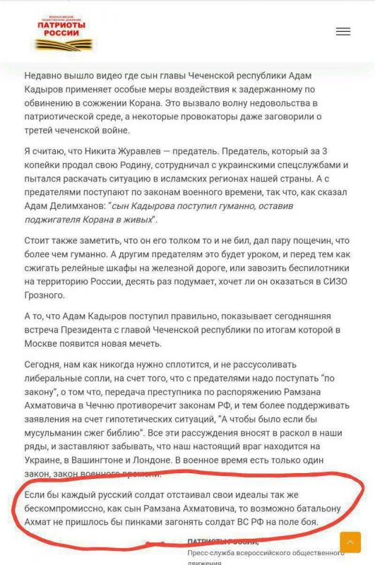 В материале на сайте движения «Патриоты России», написанном от первого лица, утверждалось, что чеченцы выполняют на СВО роль заградотрядов для русских.