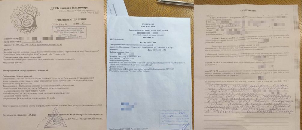 Согласно опубликованным документам, диагноз мальчика: закрытая черепно-мозговая травма, сотрясение, сломанный нос, ушибы. Мама ребёнка утверждает, что учитель отказалась вызвать скорую помощь после драки. Директриса принесла извинения и пообещала провести с хулиганами воспитательную беседу.