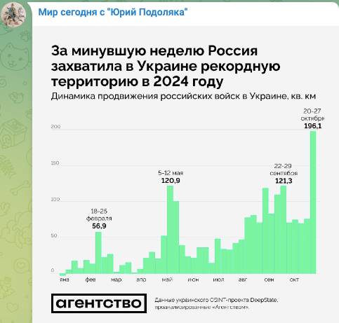 Накануне эксперт Юрий Подоляка привел ссылку на украинские издания, где говорится о том, что российские войска за прошедшую неделю (21-27 октября) освободили рекордное количество территорий. СМИ Украины даже назвали цифры - почти 200 квадратных километров, то есть по 28 кв км каждые сутки.