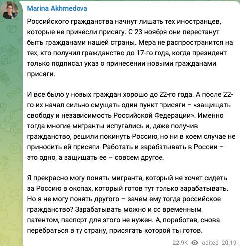 "Работать и зарабатывать в России – это одно, а защищать ее – совсем другое. Я прекрасно могу понять мигранта, который не хочет сидеть за Россию в окопах, который готов тут только зарабатывать. Но я не могу понять другого – зачем ему тогда российское гражданство? Зарабатывать можно и со временным патентом, паспорт для этого не нужен. А, поработав, снова перебраться в ту страну, присягать которой ты готов», - прокомментировала в телеграм-канале Марина Ахмедова.