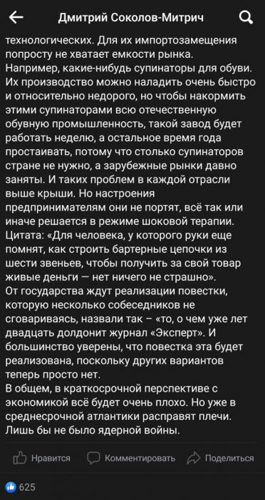 Тем не менее, они не отчаиваются и полагают, что видимого ухудшения качества российской продукции удастся избежать. В том числе благодаря навыкам выживания, которые предприниматели получили в 90-е. “Те, у кого руки помнят, как строить бартерные цепочки из шести звеньев и по итогу получать за свой товар живые деньги, быстро встроятся в новые условия", - уверен журналист.