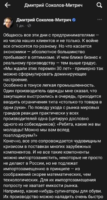 Российские производители готовы аплодировать уходящим западным конкурентам и говорить им вслед «Да какие же вы молодцы!», - рассказывает бывший главный редактор «Русского репортера» Дмитрий Соколов-Митрич, пообщавшийся с представителями «шмоточной» отрасли в России. Они признают, что проблемы будут с целым рядом расходных материалов. Например, российским производителям обуви нечем будет заменить импортные стельки-супинаторы. Но не потому, что здесь их не умеют производить, а из-за того, что строить в России их производство не имеет экономического смысла из-за очень маленького рынка. «Такой завод будет работать неделю в год, чтобы полностью обеспечить супинаторами всю отрасль», - отмечают участники рынка.