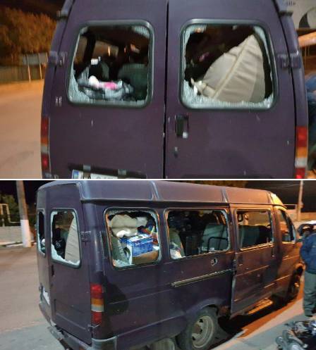В кадр попал и автомобиль, в котором находились журналисты. В автомобиле выбиты стекла.