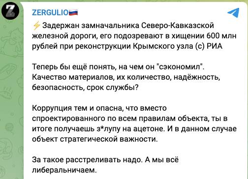 Сотрудниками ФСБ был задержан замначальника Северо-Кавказской железной дороги задержан по подозрению в превышении должностных полномочий и хищении 600 млн рублей при реконструкции Крымского узла СКЖД. По делу арестованы еще несколько фигурантов.