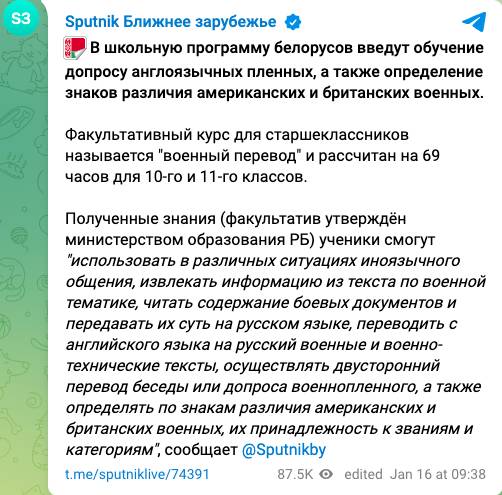 Белорусские школы вводят необычный факультативный предмет в рамках уроков английского языка. Предмет называется «Допрос англоязычного пленного». Поначалу российский военкор Александр Сладков посчитал это удачной шуткой радиостанции Sputnik в Белоруссии, где появилась эта новость, но потом добавил, что идея просто отличная.
