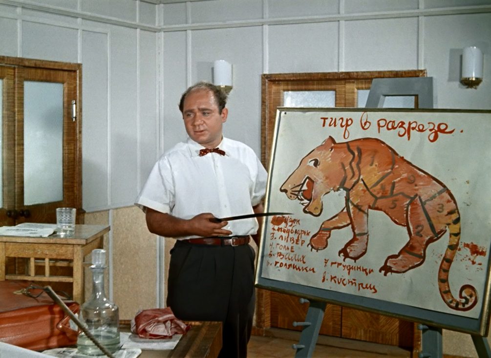 Актер вспоминал: «Посадили меня в клетку, выпустили тигров. Тигры подошли, понюхали и пошли дальше палубу осматривать. Тигры не бросаются — комедия не получается. Режиссер кричит: «Дрессировщик, почему твои животные не бросаются на артиста?» «Они к нему принюхались», — говорит, а сам запихивает ко мне в клетку живого поросенка и шепчет: «Леонов, возьми вилку, поколи поросенка, а то тигры на него не реагируют». Я говорю: «Тебе надо, ты и коли, у меня другая профессия». Зато что творилось на палубе через минуту, когда тигры учуяли поросенка! Они его через прутья поцарапали, поросенок визжит, тигры от этого еще больше свирепеют. Я кричу, поросенка прижимаю. А поросенок от страха совсем обезумел, на меня стал кидаться. Тигры рычат, поросенок визжит, я кричу: «Дрессировщик, стреляй, не то всех сожрут вместе с палубой…».