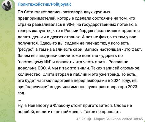 Однако политолог Марат Баширов убежден, что разговор двух бизнесменов вряд ли является фейком. В своем телеграм-канале эксперт написал, что предприниматели сделали свое состояние в 90-х, когда страна развалилась, а теперь жалуются на закончившийся «бардак» в России, а теперь придется делать деньги в других странах.