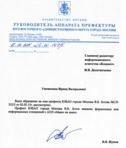 Аналогичный ответ пришел из префектуры ЮВАО, в котором сказано о том, что префект округа никаких отношений с академией персонального лидерства не имеет.