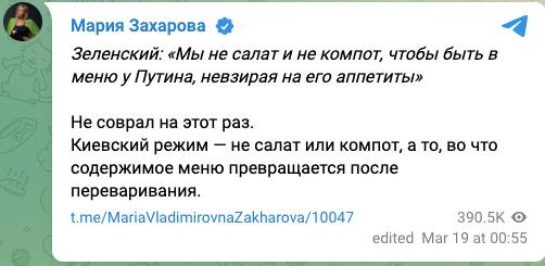 «На этот раз Зеленский не солгал. Киевский режим — не салат и не компот. Это то, во что превращается содержимое меню после переваривания», - написала в своем телеграм-канале дипломат.