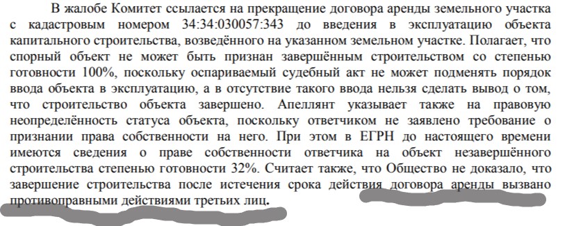 В ноябре суд в Саратове рассмотрел апелляционную жалобу Комитета по управлению государственным имуществом Волгоградской области на решение регионального арбитража по иску ведомства к ООО «Рост промышленной экологии» (Росмпромэко). Комитет настаивал на изъятии у компании объекта незавершённого строительства на земельном участке с
