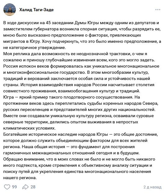 «Депутат из ХМАО Таги заде Халид Баюкага оглы, назвавший Сибирь исторической родиной узбеков, извинился. Говорит, что это было предположение, а не категоричное утверждение. А Россия испокон веков формировалась как уникальное многонациональное и многоконфессиональное государство и прочее, прочее, прочее, что нужно в таких случаях сказать.