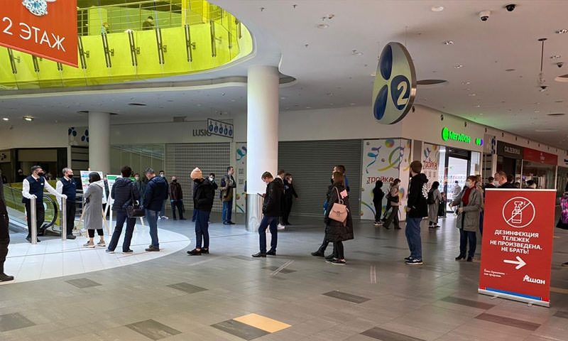 Покупатели, приехавшие в торговый центр «Тройка» на Верхней Красносельской улице, заметили толпу людей, выстроившуюся в очередь, которая тянулась через несколько этажей. Охрана перекрыла доступ на третий этаж, где располагался «Леруа Мерлен» и пускала на траволатор в порядке очереди.