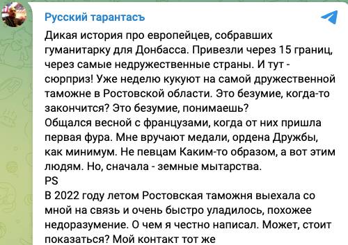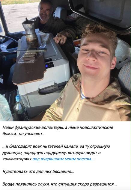 «Лишний раз в этом убедился на примере мытарств нашего французского гуманитарного конвоя, который уже почти неделю живет, как БОМЖи на таможенном КПП «Новошахтинск». Ну, нет в нашей официальной человечности и смело брать на себя ответственность», - вторит ему Сергей Богатырев.