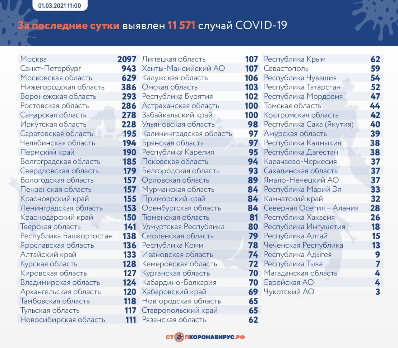 За последние сутки в России выявлен 11 571 новый случай коронавируса в 84 регионах.