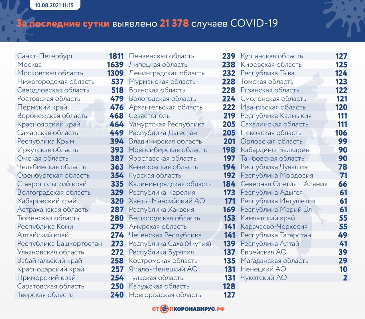 За последние сутки в России выявлено 21 378 случаев COVID-19 в 85 регионах