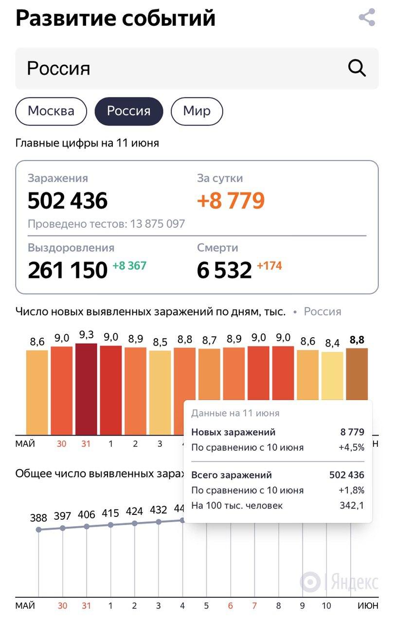 Число заболевших COVID-19 в России превысило 500 тысяч человек.